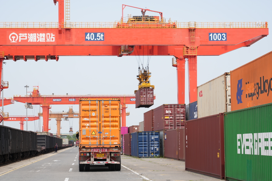 5月8日,上海芦潮港中心站进行海铁联运卸车作业 李嘉 摄
