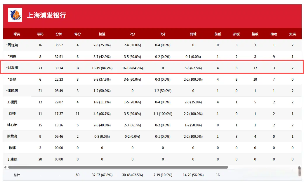 从数据来看,不得不佩服上海队的眼光与魄力了,刘禹彤绝对是一流的高手,此役出战30分钟,她19投16中,8罚5中,独砍37分,几乎占了全队得分的一半。另外,刘禹彤还拿到了12个篮板球,另有3次助攻2抢断2盖帽,十分全面。此外,刘帅拿到11分,39岁老将黄靖拿到8分10篮板7助攻,真是宝刀不老啊。